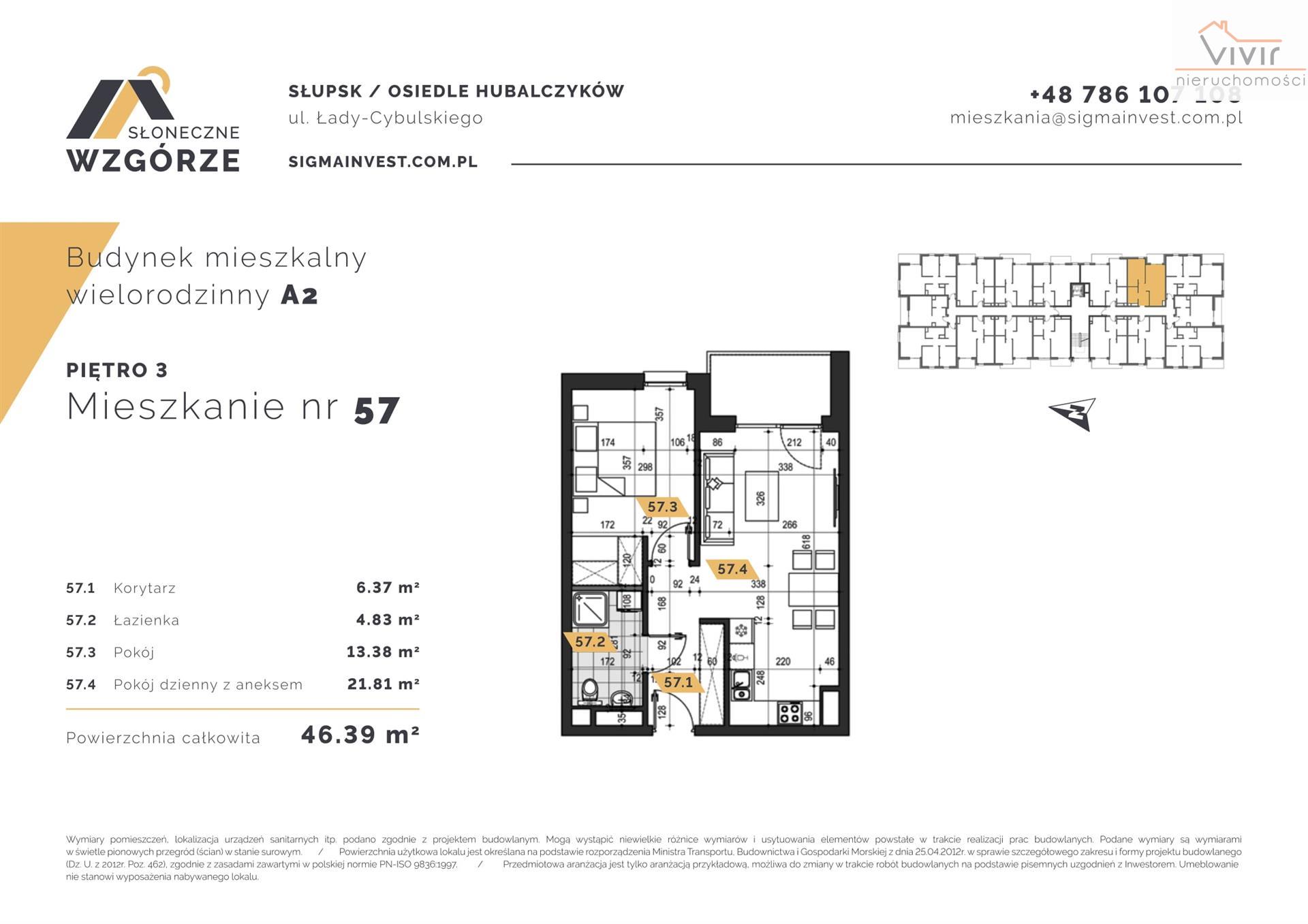 W NINIEJSZYM OGŁOSZENIU PROPONUJĘ PAŃSTWU DO ZAKUPU DWUPOKOJOWE MIESZKANIE NR 57 O POW. UŻYTKOWEJ 46,20 MKW. ZNAJDUJĄCE SIĘ NA TRZECIM PIĘTRZE BLOKU WIELORODZINNEGO. DO LOKALU PRZYNALEŻY BALKON O POW. 4,35 MKW.